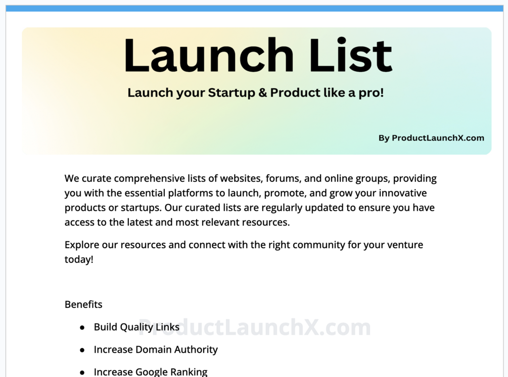 1) 31 SaaS/Software platforms 2) 78 Startup Directories & Launch Platforms 3) 62 Relevant and active SubReddits 4) 87 FB Groups 5) Bonus: Google Tips to Find Guest Posting Sites.